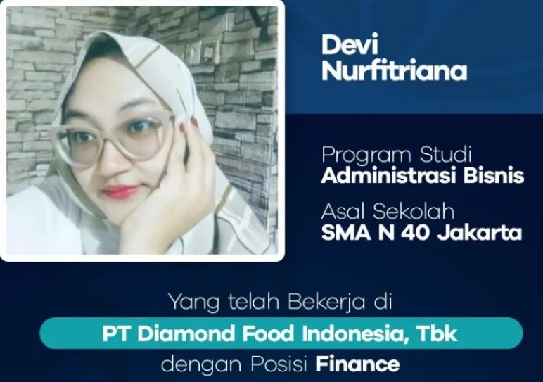 Masih dari program studi yang sama, Devi Nurfitriana (lulusan SMA N 40 Jakarta) juga menorehkan jejak sukses. Devi kini menempati posisi strategis sebagai Finance di PT Diamond Food Indonesia, Tbk, salah satu perusahaan F&B terbesar di Indonesia. Hal ini menunjukkan fleksibilitas lulusan Administrasi Bisnis LP3I untuk masuk ke berbagai lini fungsional perusahaan, termasuk keuangan.