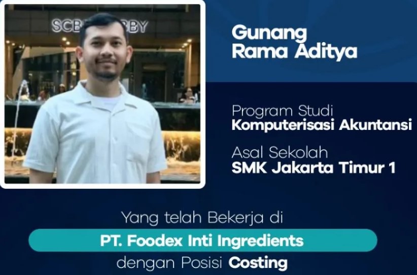 Di sektor teknologi dan akuntansi, Gunang Rama Aditya (lulusan SMK Jakarta Timur 1) dari Program Studi D3 Komputerisasi Akuntansi, berhasil mengaplikasikan ilmunya di PT. Foodex Inti Ingredients. Gunang dipercaya memegang peran sebagai Costing, sebuah posisi vital yang menuntut ketelitian tinggi dalam analisis biaya produksi, membuktikan relevansi keilmuan Komputerisasi Akuntansi dengan kebutuhan industri manufaktur.
