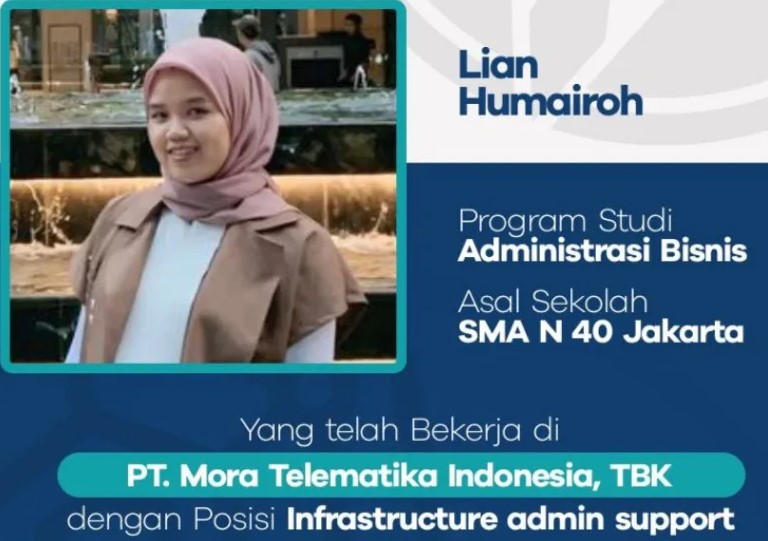 Kisah sukses lainnya datang dari Lian Humairoh (lulusan SMA N 40 Jakarta), yang juga alumni Program Studi D3 Administrasi Bisnis. Lian kini berkarya di PT. Mora Telematika Indonesia, Tbk sebagai Infrastructure Admin Support. Penempatan ini menunjukkan bahwa kompetensi administrasi sangat dibutuhkan, bahkan di perusahaan telekomunikasi dan infrastruktur teknologi terkemuka.