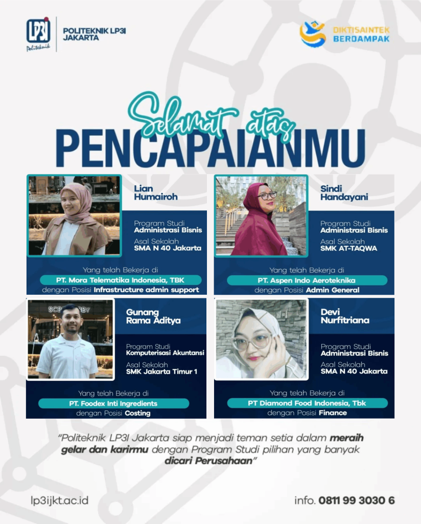Keberhasilan ini tercermin dari kisah inspiratif empat alumni yang telah memulai karir profesional mereka. Keempatnya merupakan representasi dari keberhasilan proses pendidikan berbasis praktik yang menjadi ciri khas Politeknik LP3I Jakarta.