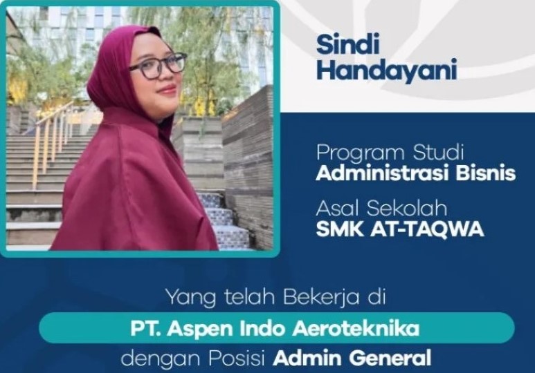 Sindi Handayani, lulusan Program Studi D3 Administrasi Bisnis yang berasal dari SMK At-Taqwa, kini telah bergabung dengan PT. Aspen Indo Aeroteknika sebagai Admin General. Pencapaian Sindi membuktikan bahwa lulusan Administrasi Bisnis dibekali kemampuan administratif yang solid untuk mendukung operasional perusahaan di sektor teknis.