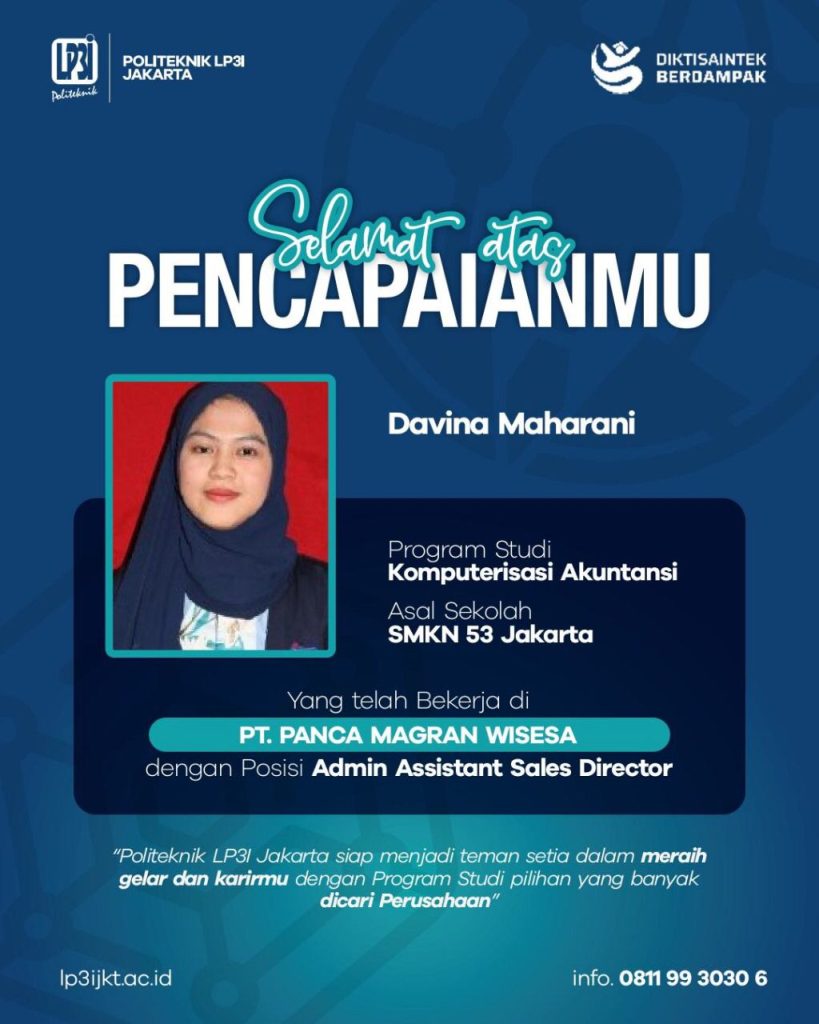 - Davina Maharani Lulusan Program Studi D3 Komputerisasi Akuntansi dari SMKN 53 Jakarta, Davina Maharani, sukses menduduki posisi Admin Assistant Sales Director di PT. Panca Magran Wisesa. Keterampilan Davina dalam pengelolaan data dan administrasi keuangan menjadi aset berharga dalam mendukung divisi penjualan perusahaan.