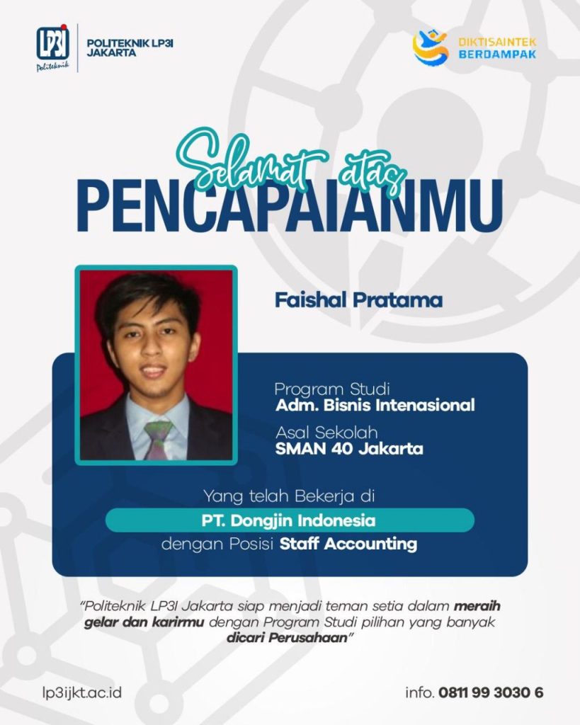 - Faishal Pratama Faishal Pratama, alumni Program Studi D4 Administrasi Bisnis Internasional dari SMAN 40 Jakarta, kini telah meniti karir di PT. Dongjin Indonesia sebagai Staff Accounting. Kemampuan analitis dan pemahaman bisnis global yang diperoleh Faishal di LP3I membawanya pada peran penting dalam pengelolaan keuangan perusahaan multinasional.