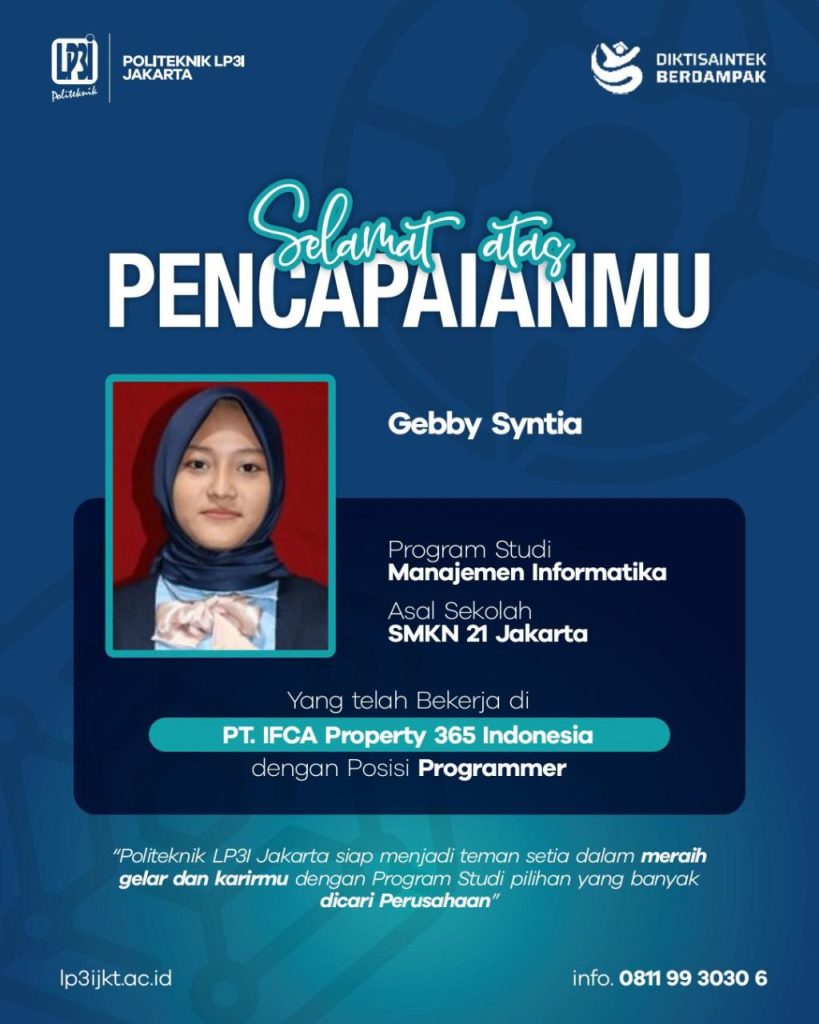 - Gebby Syntia Terakhir, Gebby Syntia dari Program Studi D3 Manajemen Informatika (lulusan SMKN 21 Jakarta), telah menunjukkan kemampuan teknisnya di dunia pemrograman. Gebby kini berkarir sebagai Programmer di PT. IFCA Property 365 Indonesia, menegaskan bahwa LP3I mencetak talenta IT yang siap langsung berkontribusi dalam pengembangan perangkat lunak.