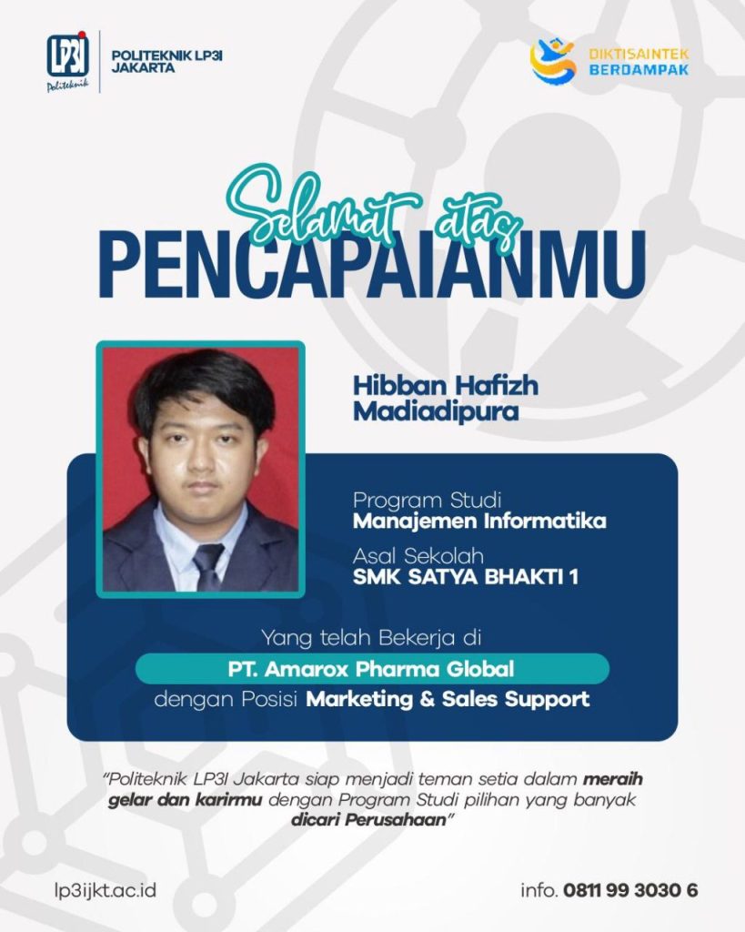 - Hibban Hafizh Madiadipura Dari Program Studi D3 Manajemen Informatika (lulusan SMK Satya Bhakti 1), Hibban Hafizh Madiadipura membuktikan kompetensinya di bidang teknologi. Ia kini berkarya di PT. Amarox Pharma Global sebagai Marketing & Sales Support, menunjukkan bahwa keahlian informatika sangat relevan dalam mendukung strategi pemasaran dan penjualan di industri farmasi.