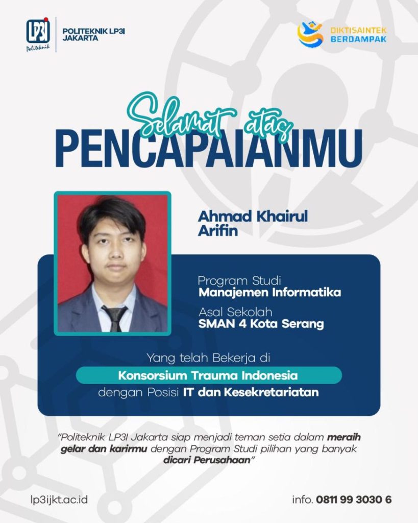 - Ahmad Khairul Arifin Ahmad Khairul Arifin, juga dari Program Studi D3 Manajemen Informatika (alumni SMAN 4 Kota Serang), menunjukkan fleksibilitas keahliannya. Ahmad kini berkontribusi di Konsorsium Trauma Indonesia dengan posisi IT dan Kesekretariatan, sebuah bukti bahwa lulusan informatika LP3I siap mengatasi berbagai tantangan teknis dan administratif.